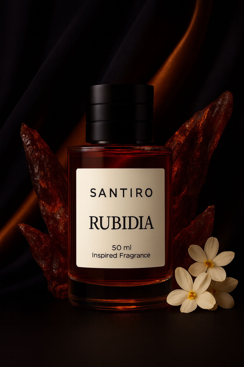 Rubidia joue les contrastes : éclat épicé, cœur floral lumineux, profondeur ambrée et boisée. La matière brille sans jamais crier, comme une robe qui capte la lumière — présence assurée, allure magistrale, modernité assumée.